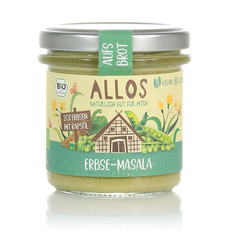 Lust auf etwas Neues auf dem Brot? Dann probiert den Erbsenliebe-Aufstrich von Allos aus. Er ist pflanzlich, proteinreich und voller Geschmack. Mit der indischen Gewürzmischung Garam Masala verleiht er eurer Stulle eine orientalische Note. Erbsenliebe ist nicht nur lecker auf dem Brot, sondern auch als Dip für Gemüsesticks oder als Sauce für Reisgerichte. Lasst euch von der grünen Farbe nicht abschrecken – sie ist ganz natürlich und kommt von den frischen Erbsen. Probiert es aus und verliebt euch in Erbsenliebe!