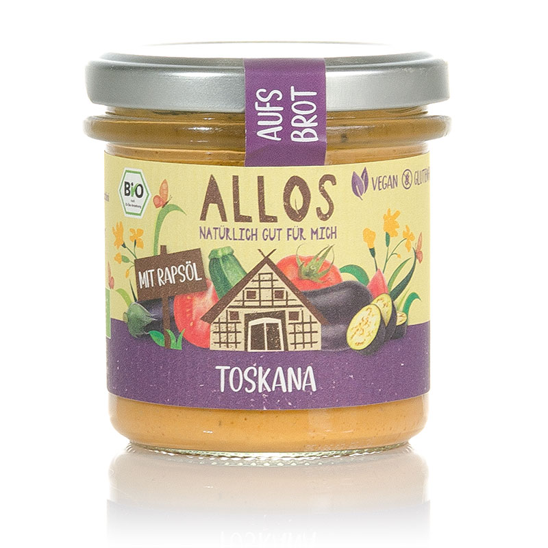 Der Bio aufs Brot Toskana von Allos ist ein aus dem beliebten Gemüsegericht kreierter Brotaufstrich, der euch das Urlaubsfeeling nach Hause bringt. Der Ratatouille-Aufstrich ist pflanzlich und enthält Tomatenmark, Aubergine und Zucchini, die mit Kräutern und Gewürzen abgeschmeckt sind. Er ist ideal für alle, die sich nach etwas Sonne auf dem Brot sehnen. Er schmeckt aber auch als Dip für Cracker oder als Sauce für Nudeln.