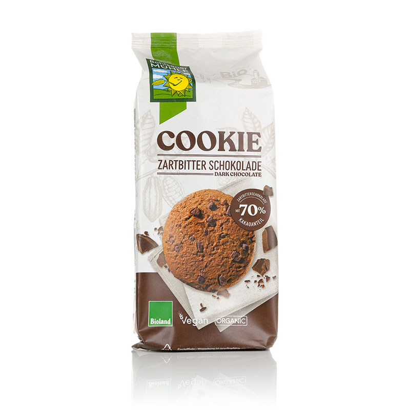 Die Bio Cookie Zartbitter von der Bohlsener Mühle sind Weizenkekse mit Zartbitter-Schokoladenstückchen mit einem Kakaoanteil von 70% .