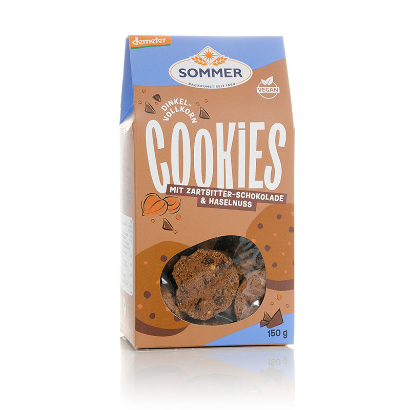Die Bio Dinkel Schoko Cookies von Sommer sind aus Dinkelvollkornmehl, Rübenzucker, Haselnüsse und Zartbitterschokolade hergestellt. Einfach zum Nachmittags-Kaffee oder zwischendurch geniessen.
