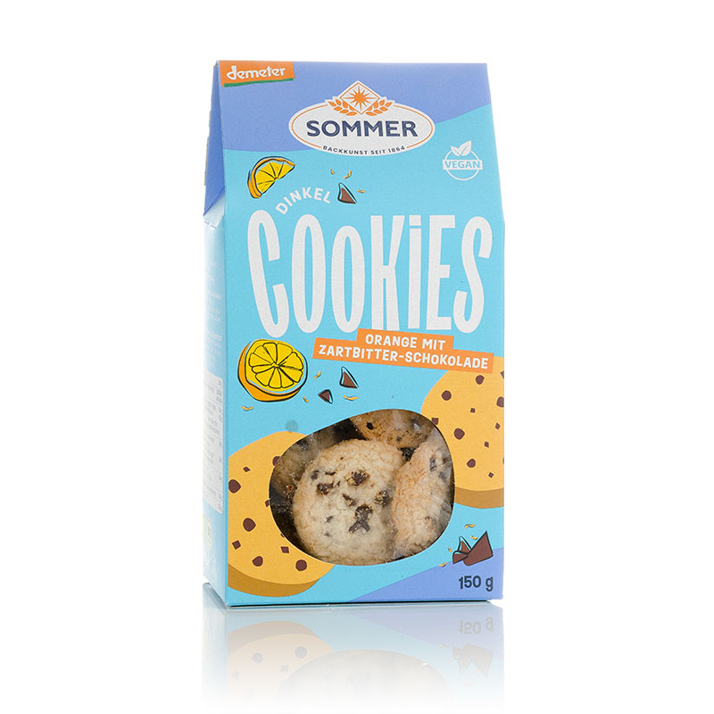 Die Bio Dinkel Schoko-Orange Cookies von Sommer sind wunderbar knusprig aus herber Zartbitterschokolade und fruchtiger Orange hergestellt.