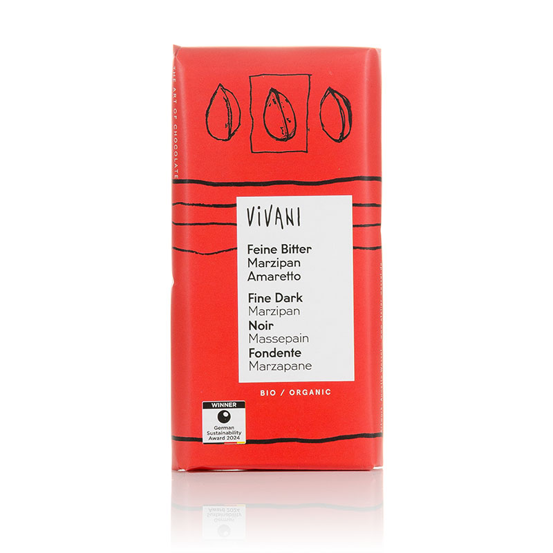 Die Bio feine Bitter Marzipan-Amaretto Schokolade von Vivani besticht mit einer cremigen Marzipanfüllung und einer eleganten Amaretto-Note – umhüllt mit zarter Bitter-Schokolade.