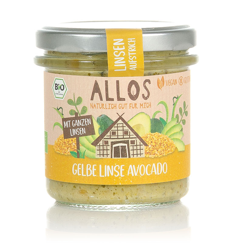 Bio Gelbe Linse Avocado von Allos – Aufstrich aufs Brot, macht Wangen rot. Ist eine alte Linsen-Weisheit und heute noch so wahr wie vor vielen tausend Jahren. Ja, Linsen stehen schon wirklich lange auf unserem Speiseplan. Und das vollkommen zurecht. Denn sie sind echtes Superfood. Super proteinreich. Super energiereich. Super lecker. Und da sie in verschiedenen Farben kommen, sind sie auch super abwechslungsreich. Perfekt aufs Brot, als Dip oder als geheime Zutat für euer Dressing