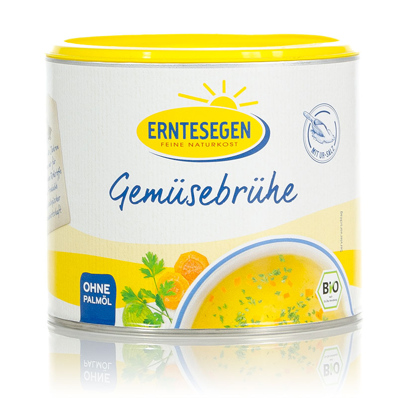 Bio Gemüsebrühe Dose von Erntesegen ist eine vegane Gemüsebrühe, die würzig und köstlich schmeckt. Auch als Trinkbrühe, Suppengrundlage oder zum Würzen für Gemüse- und Fleischgerichte geeignet.