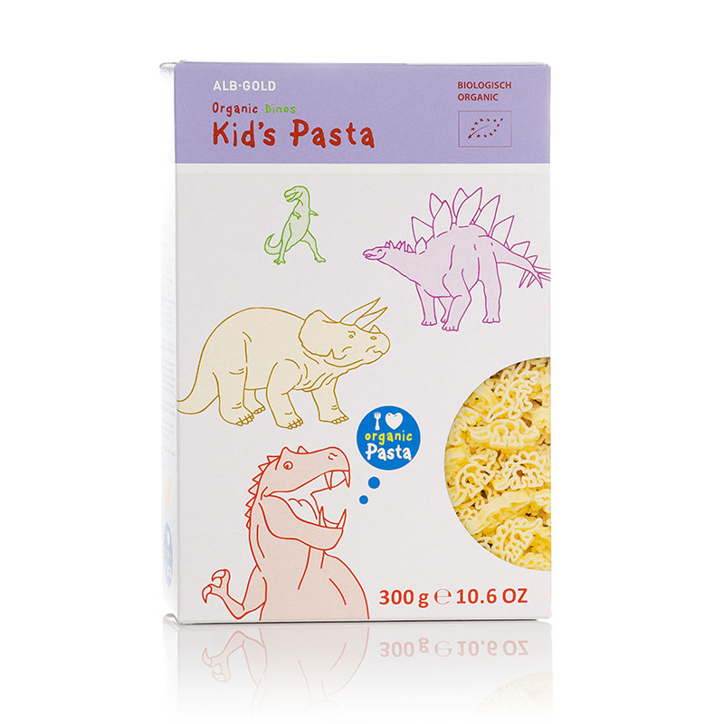 Die Bio Kids Pasta Dinos von Albgold sind aus feinstem Hartweizengrieß hergestellt. Drei verschiedene Dino-Ausformungen längst vergangener Zeit darauf, in der Gegenwart kulinarische Abenteuer zu erleben. Ideal in Suppen, Soßen oder zu Gemüse.