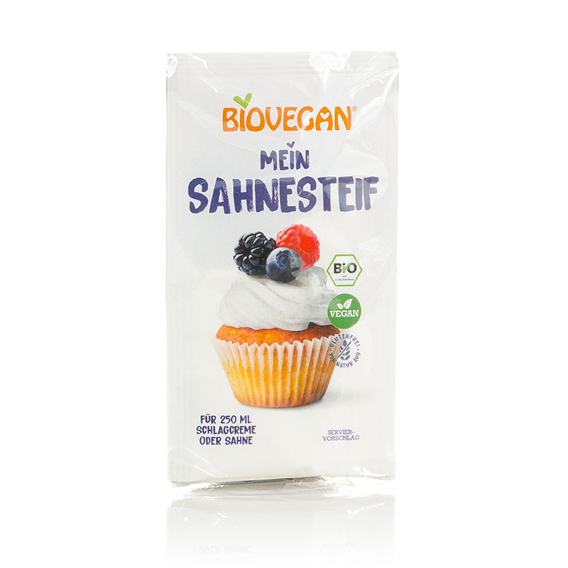 Bio Sahnesteif von Biovegan verleiht deinen Sahnetorten, Eiskreationen, Dessertcremes oder einfach nur Sahne die nötige Festigkeit und Konsistenz, ganz glutenfrei.