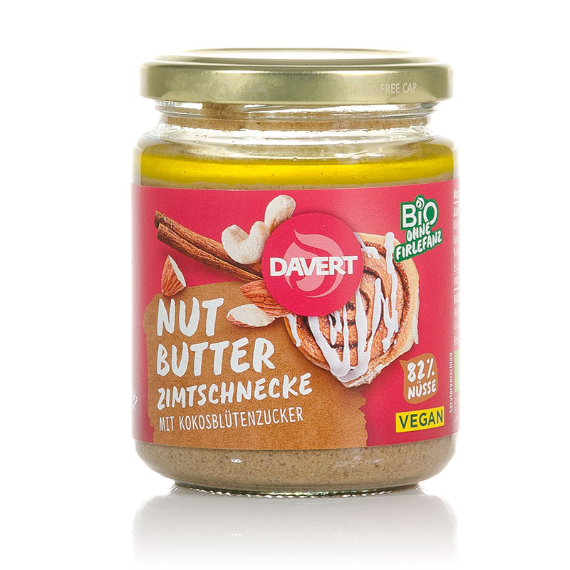 Der Bio Nut Butter Zimtschnecke Aufstrich von Davert beinhaltet Nüsse, feine Mandeln und Cashews, verfeinert mit karamelligem Kokoblütenzucker und einer Prise Zimt. Der Aufstrich ist vielseitig einsetzbar, z.B. als Topping, zum Löffeln oder auf Brot.