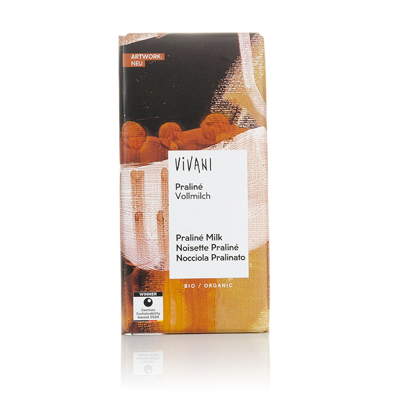 Die Bio Praline Vollmilch Schokolade von Vivani – feinste Vollmilch-Schokolade mit zartschmelzender, cremiger Haselnuss-Nougat-Füllung.