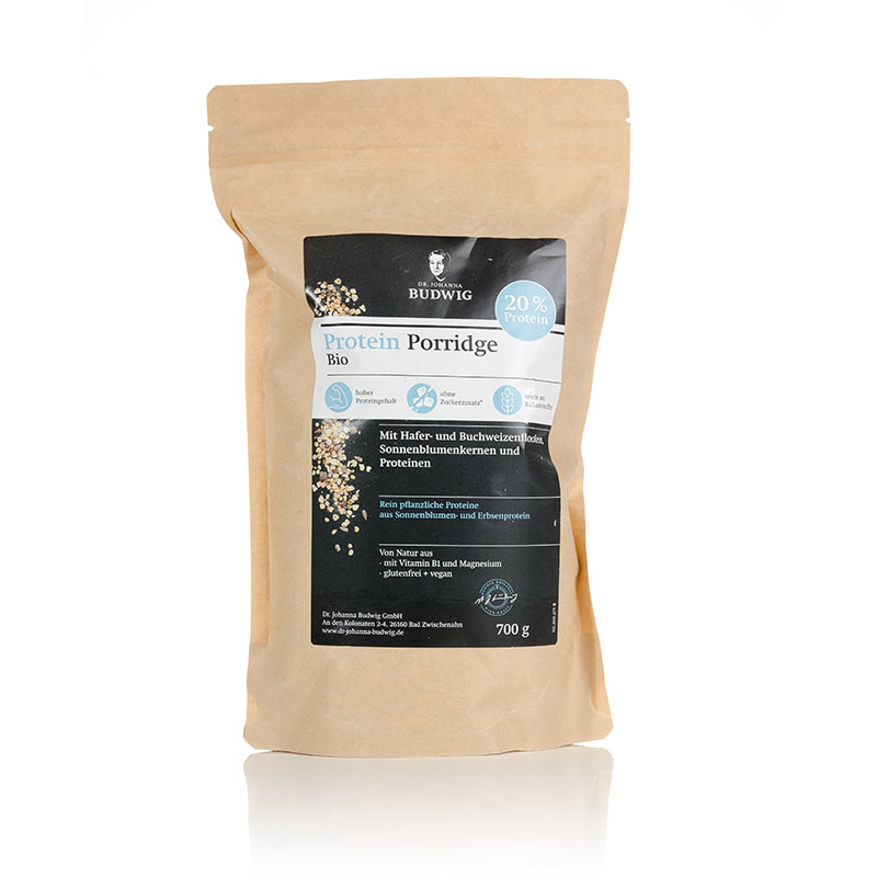 Das Bio Protein Porridge von Dr. Budwig beinhaltet Hafer- und Buchweizenflocken, Sonnenblumenkerne und Proteine. Damit du kraftvoll in den Tag starten kannst, einfach in Wasser oder Milch einrühren.