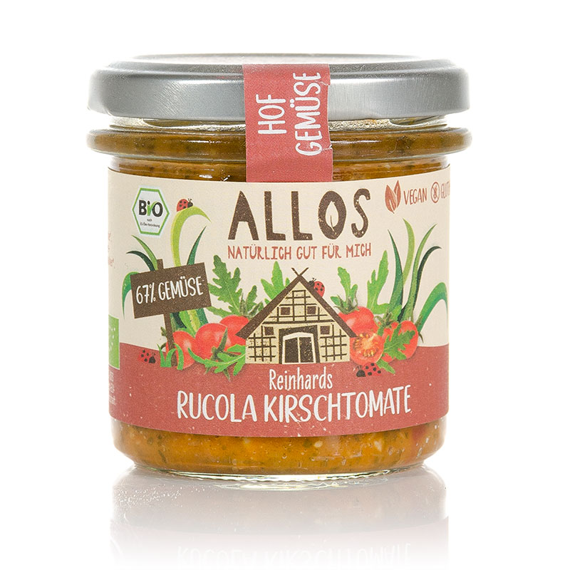Der Bio Reinhards Rucola Kirschtomate Brotaufstrich von Allos ist aus satten 100% Gemüse. Ob aufs Brot, als Dip oder zum Verfeinern ihrer Nudel-Gerichte.