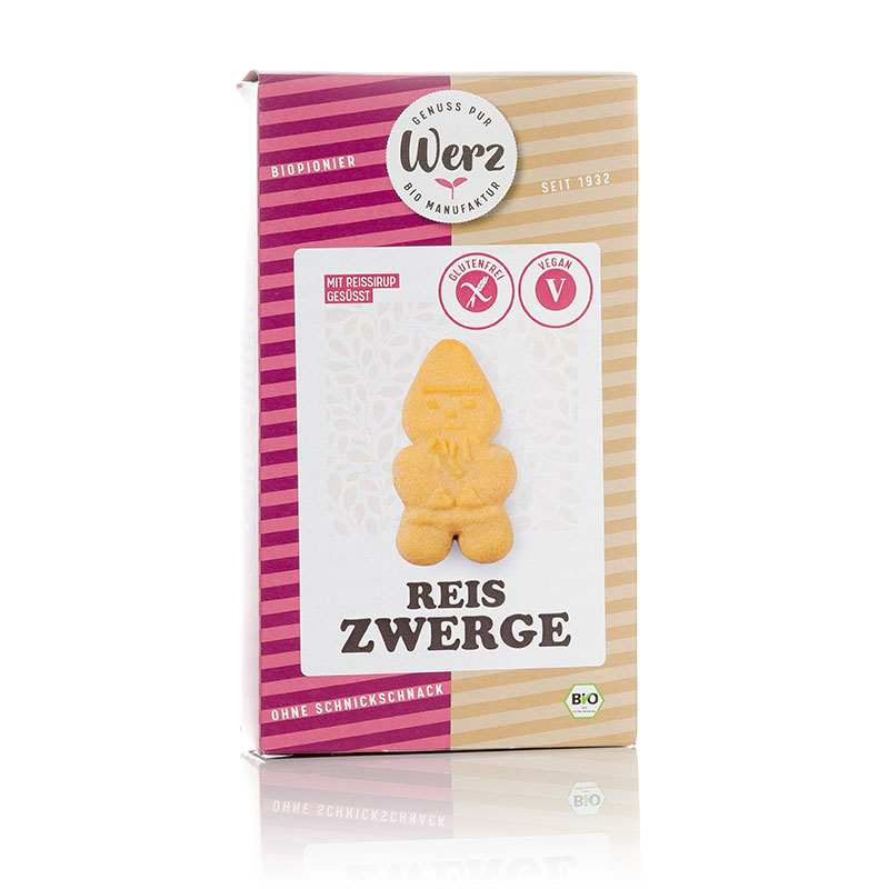 Die Bio Reis-Zwerge glutenfrei von Werz sind Vollkornkekse in Zwergenform, mit Reis-Sirup gesüßt. Die glutenfreien Reis-Zwerge schmecken besonders gut, zu einer Tasse Kaffee oder Tee