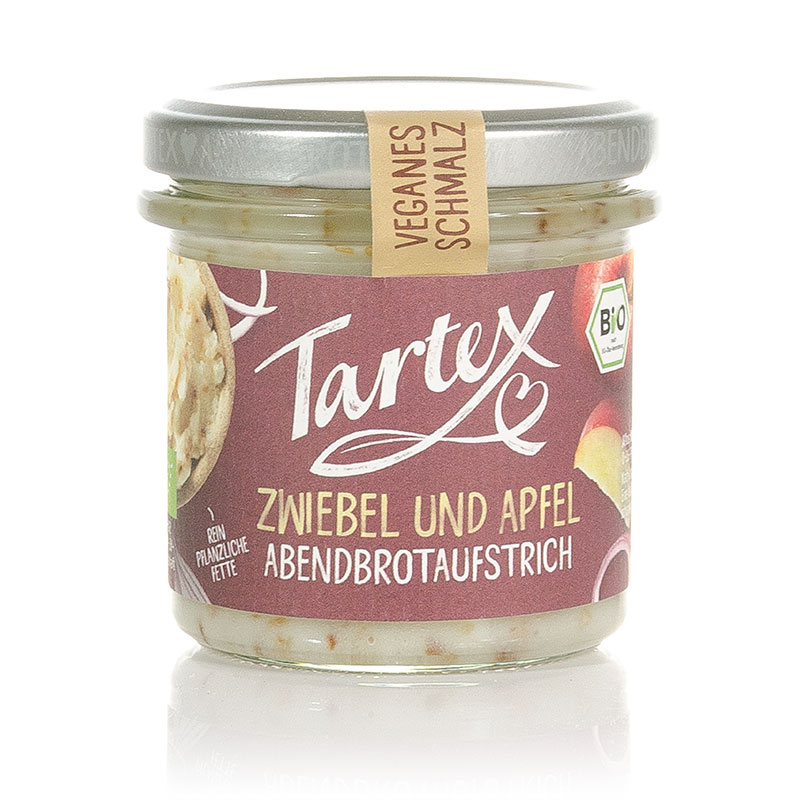 Der vegane Bio Schmalz Topf Zwiebel Apfel von Tartex ist der leckere Brotaufstrich und gute Grundlage für Dips.