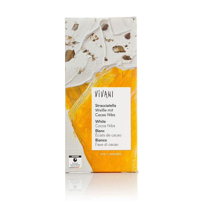 Bio Stracciatella mit Cacao Nibs von Vivani enthält cremige weiße Schokolade, Bourbon Vanille und knusprige Kakao Nibs – der leicht bittere Kontrast zur feinen Schokolade.