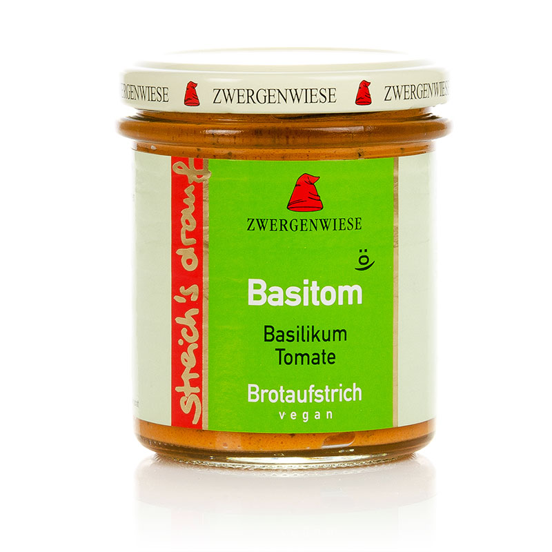 Der leichte, cremige Brotaufstrich mit einer pikant-herzhaften Note – der Bio Streich s drauf Basitom von Zwergenwiese.