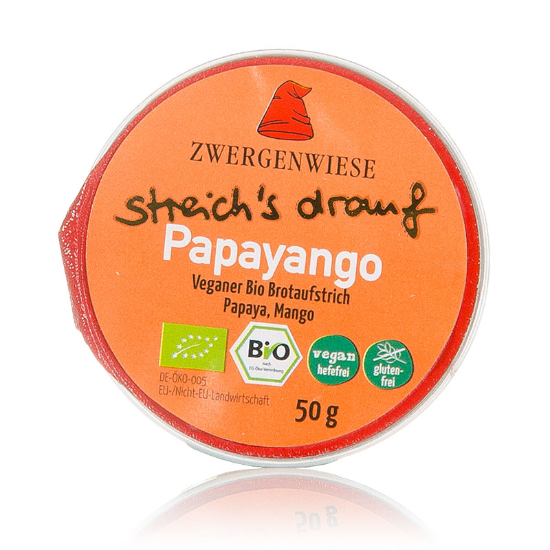 Der Bio Streich s drauf Papayango von Zwergenwiese ist ein besonders cremiger Brotaufstrich auf Basis von Bio-Rapsöl und deutschen Bio-Sonnenblumenkernen, mit Papaya und Mango. Ideal als Dip, zum Kochen oder einfach pur aufs Brot.