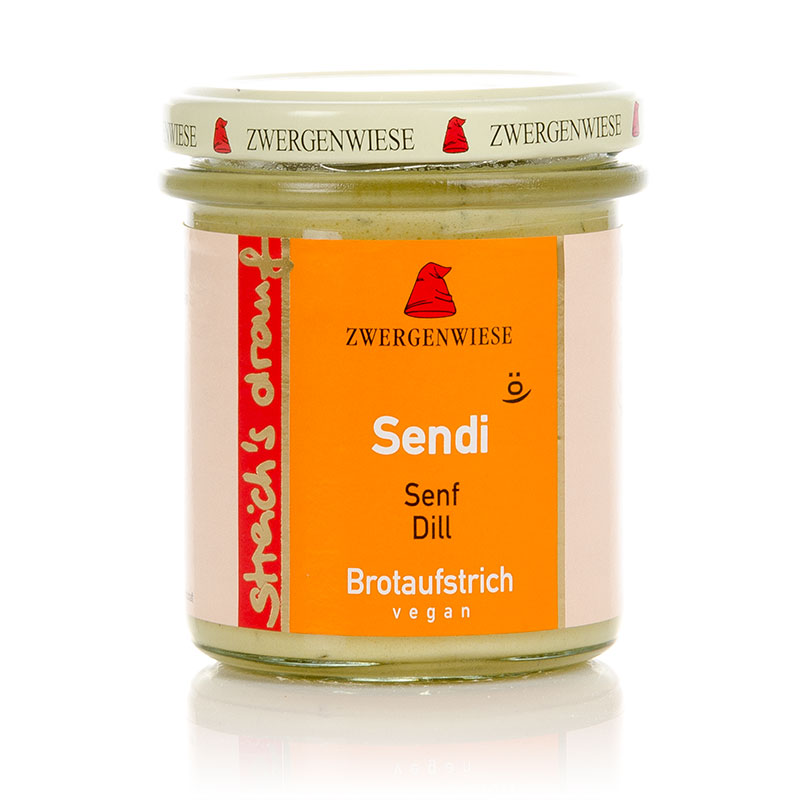 Der Bio Streich s drauf Sendi von Zwergenwiese ist ein veganer Brotaufstrich mit Senf und Dill. Dieser ist bereits verzehrfertig und hitzebehandelt. Sendi schmeckt pur aufs Brot, als Dressing in Salaten oder als leckerer Dip.