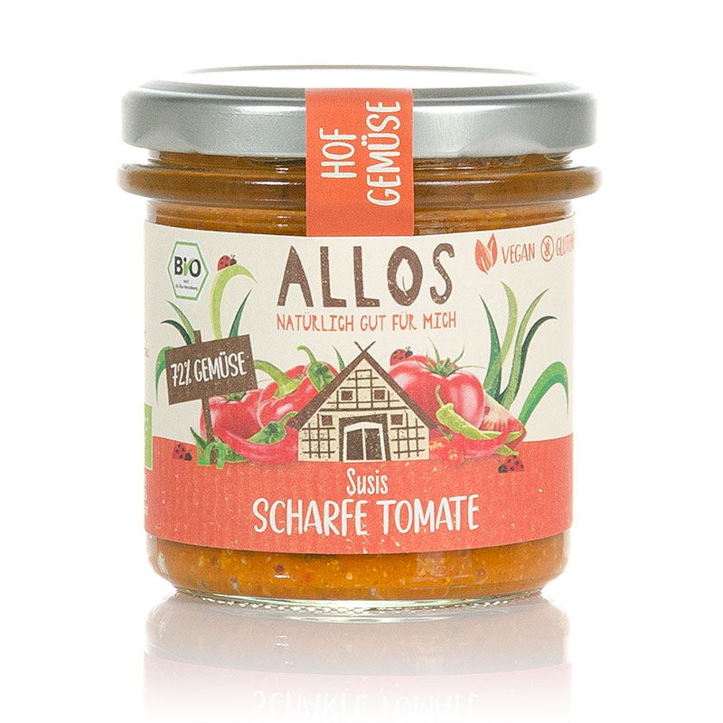 Der Bio Susis scharfe Tomate Brotaufstrich von Allos ist rein pflanzlich aus Tomaten, Paprika und Chili hergestellt. Ob aufs Brot, für Bruschetta, als Dip oder zum Verfeinern ihrer Nudel-Gerichte.