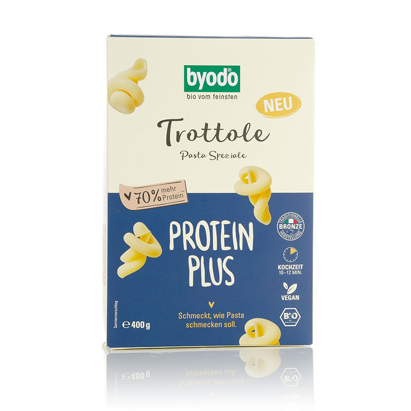 Die Bio Trottole Pasta von Byodo wird aus italienischem Hartweizengrieß, proteinreichem Weizeneiweiß und hochwertigem Kürbiskernmehl hergestellt. Die Soße dazu bleibt deine Wahl!