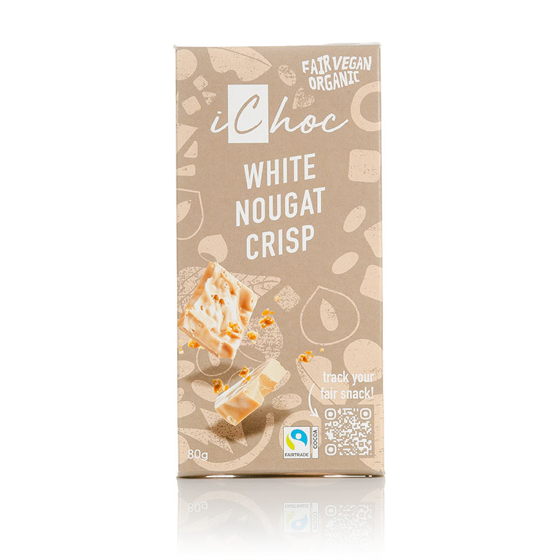 Die Bio vegan White Nougat Crisp Schokolade von iChoc ist die vegane weiße Bio Schokolade mit Haselnusskrokant.