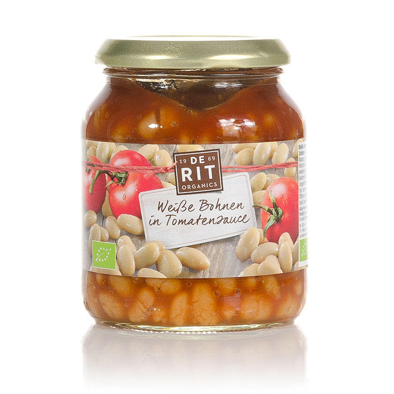 Bio Weiße Bohnen in Tomatensauce von De Rit – vegan und ohne SchnickSchnack! Einfach Glas öffnen, erwärmen und genießen!