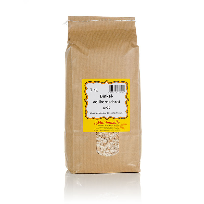 Unser Dinkelvollkornschrot grob – grob zerkleinertes Erzeugnis aus dem ganzen Dinkelkorn, inklusive Schale, Keimling und Mehlkörper. Ideal zum Backen von Vollkorn- und Körnerbroten, für Getreidebreie oder als Zutat für Müslis. Rustikaler Biss, hoher Ballaststoffgehalt und ein nussig, leicht süßlicher Geschmack!