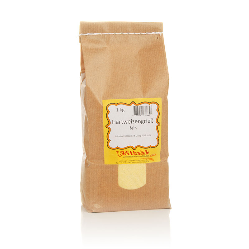 Hartweizengrieß kaufen, feiner Grieß, der etwas gröber als Mehl ist und daher ideal zur Herstellung von Nudeln, Pasta, Spätzle sowie für Grießklöße, Grießschnitten, Klöße und Grießnockerln, als Suppeneinlage und für alle Teige, die fest werden sollen.