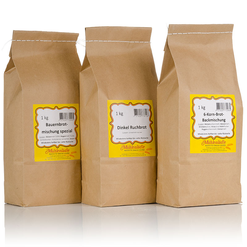 – Bauernbrotmischung spezial (1kg) Unsere Eigenrezeptur aus dunklem Weizen- und Roggenmehl, verfeinert mit Kürbiskernen, Sonnenblumenkernen, Leinsamen und Sesam. Das Ergebnis: ein kerniges Brot mit viel Protein, ungesättigten Fettsäuren und wichtigen Vitaminen. Die kräftige, krosse Kruste und die helle, saftige Krume machen es zum aromatischen Klassiker, der auch am nächsten Tag frisch bleibt. Ideal für den Backofen oder Brotbackautomaten.